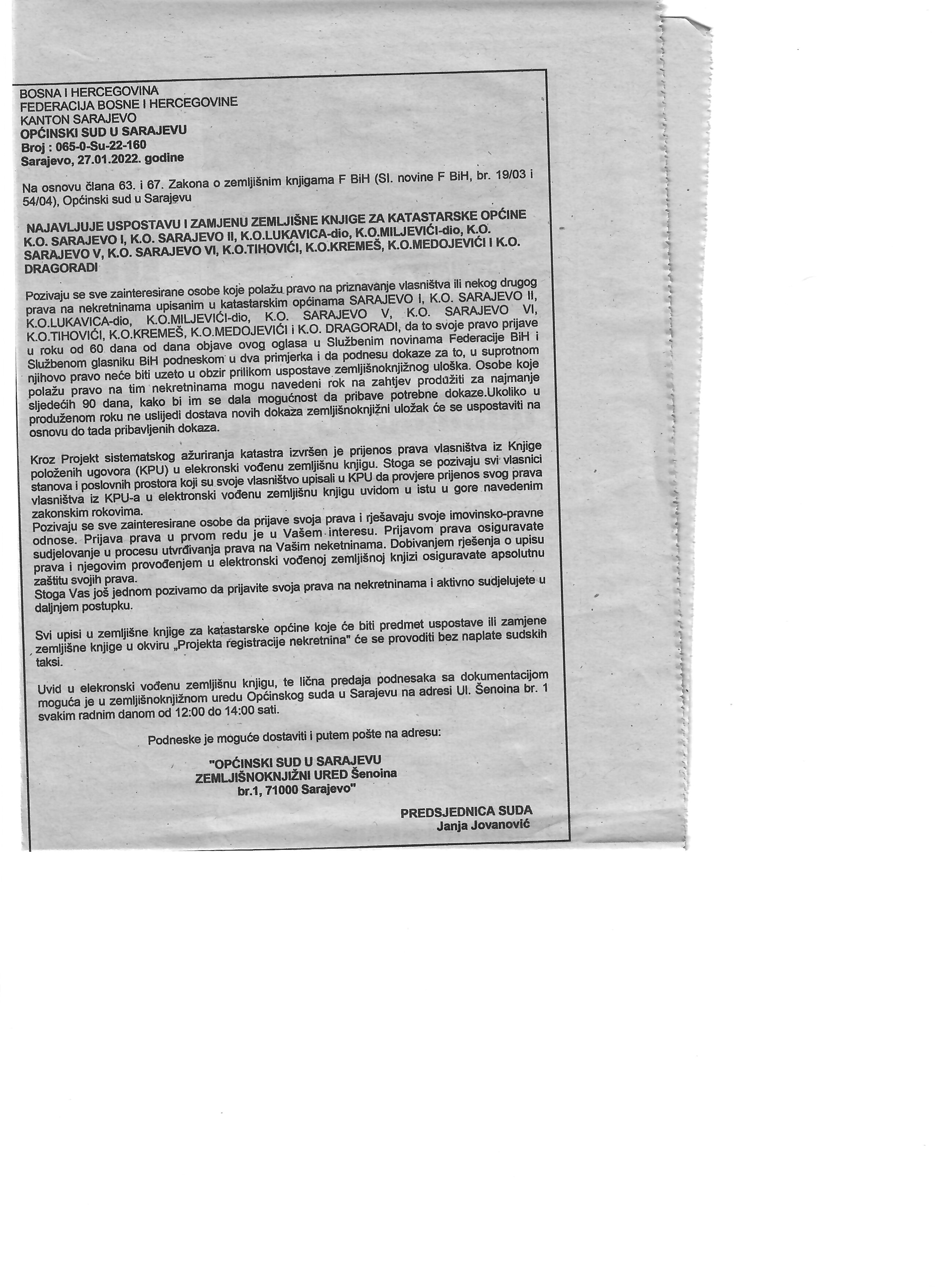 ОПЋИНСКИ СУД У САРАЈЕВУ НАЈАВЉУЈЕ УСПОСТАВУ И ЗАМЈЕНУ ЗЕМЉИШНЕ КЊИГЕ ЗА К.О. САРАЈЕВО И, К.О. САРАЈЕВО ИИ, К.О.ЛУКАВИЦА-ДИО, К.О.МИЉЕВИЋИ-ДИО, К.О. САРАЈЕВО В, К.О. САРАЈЕВО ВИ, К.О.ТИХОВИЋИ, К.О.КРЕМЕШ, К.О.МЕДОЈЕВИЋИ И К.О. ДРАГОРАДИ