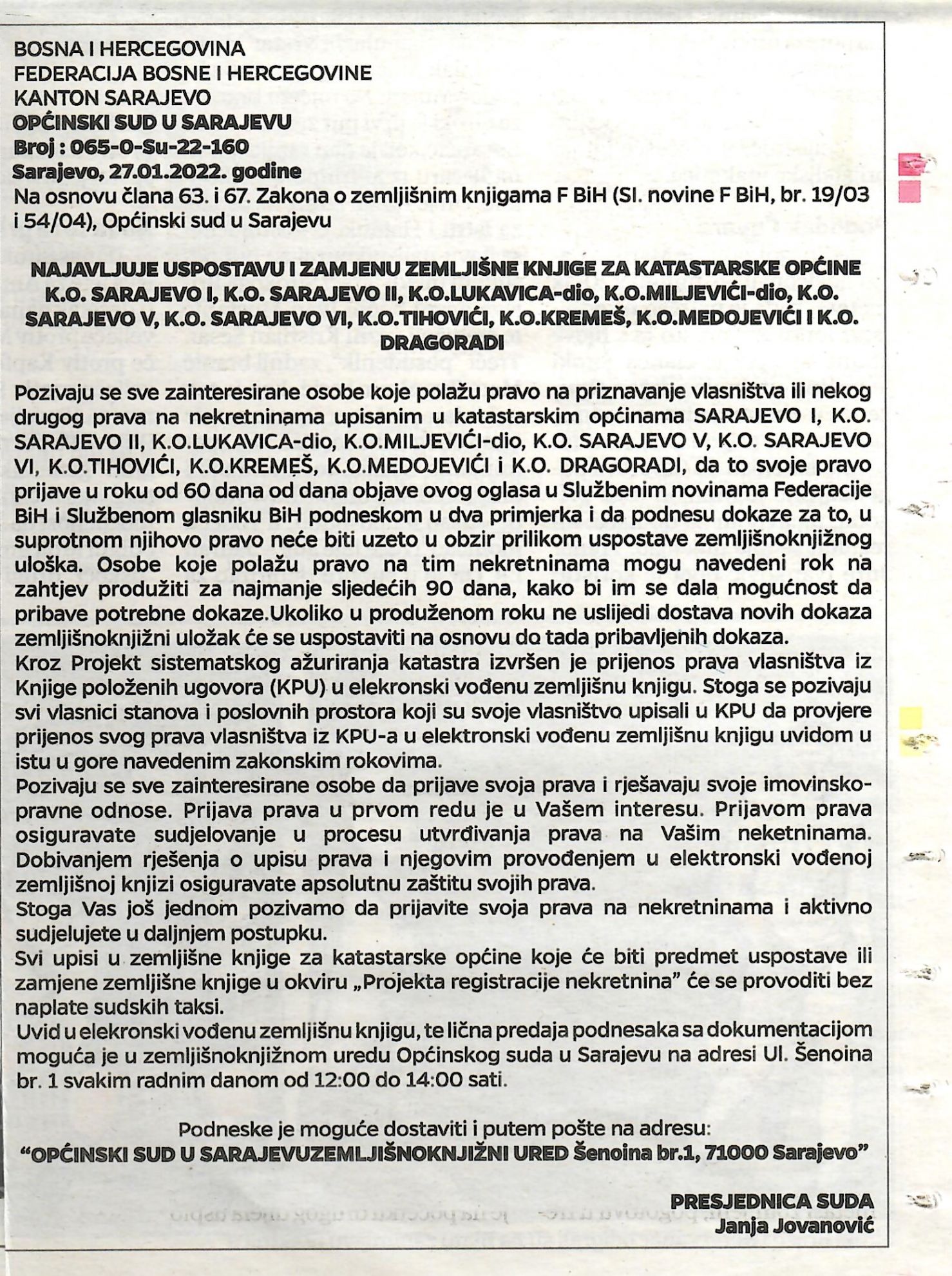 Позивају се све заинтересиране особе које полажу право на признавање власништва или неког другог права на некретнинама уписаним у катастарским опћинама САРАЈЕВО И, К.О. САРАЈЕВО ИИ, К.О.ЛУКАВИЦА-дио, К.О.МИЉЕВИЋИ-дио, К.О. САРАЈЕВО В, К.О. САРАЈЕВО ВИ, К.О.ТИХОВИЋИ, К.О.КРЕМЕШ, К.О.МЕДОЈЕВИЋИ и К.О. ДРАГОРАДИ, да то своје право пријаве у року од 60 дана од дана објаве овог огласа у Службеним новинама Федерације БиХ и Службеном гласнику БиХ поднеском у два примјерка и да поднесу доказе за то, у супротном њихово право неће бити узето у обзир приликом успоставе земљишнокњижног улошка. Особе које полажу право на тим некретнинама могу наведени рок на захтјев продужити за најмање сљедећих 90 дана, како би им се дала могућност да прибаве потребне доказе.Уколико у продуженом року не услиједи достава нових доказа земљишнокњижни уложак ће се успоставити на основу до тада прибављених доказа.